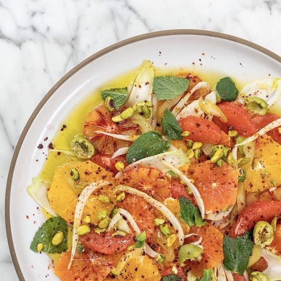 - Arrange the citrus on the plate and top with the fennel, olives, pickled celery (if using), toasted pistachios, fresh herbs and seasonings. Drizzle with a little olive oil and serve.