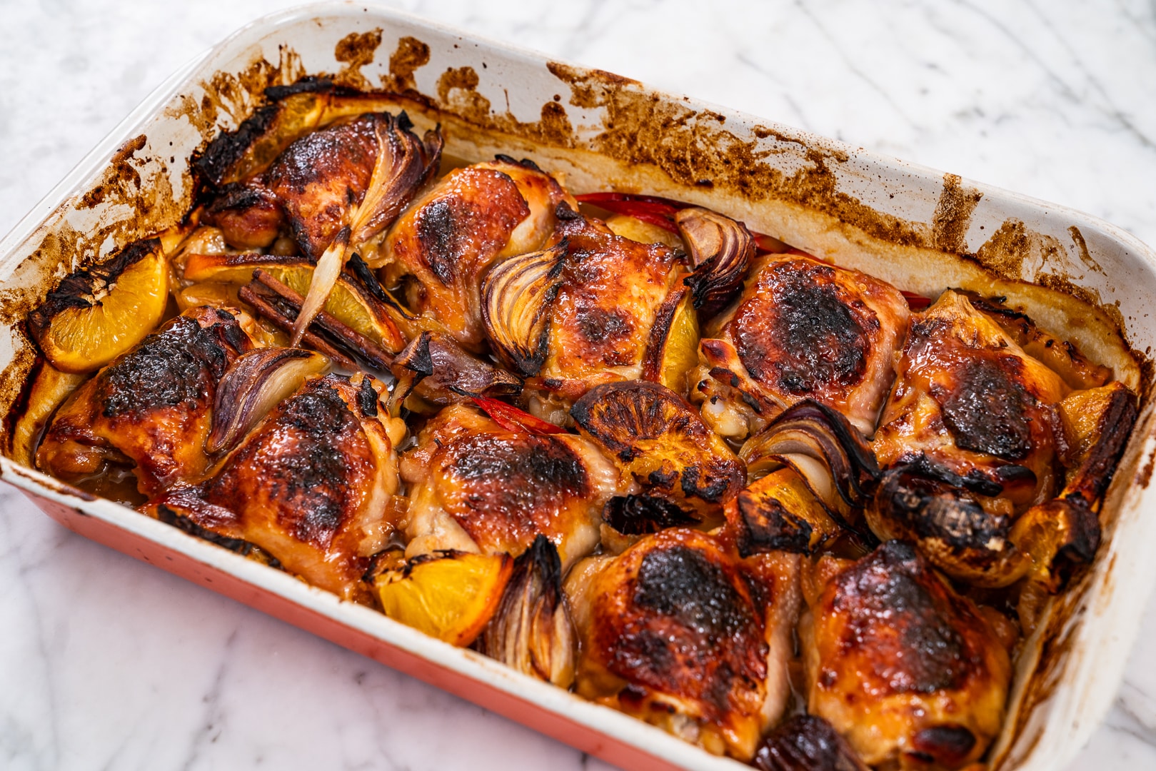 - Pour the chicken pieces and all the marinade and aromatics into a roasting tray, preferably oven to table friendly, where they can fit comfortably in one layer. Drizzle with a little olive oil and a final sprinkle of salt. Roast for 1 hour, basting every 20 minutes or so.