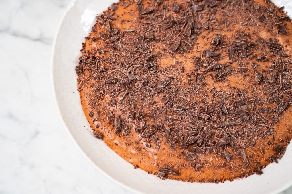 - Pour the chocolate mixture into a shallow round dish or equivalent, or any large or individual receptacle of choice cover with cling film and place in the freezer for at least 2-3 hours until completely set. Move into the fridge 2 hours before serving to allow to defrost. If you choose to make this in a deeper bowl you may want to give yourself a little extra defrosting time.
