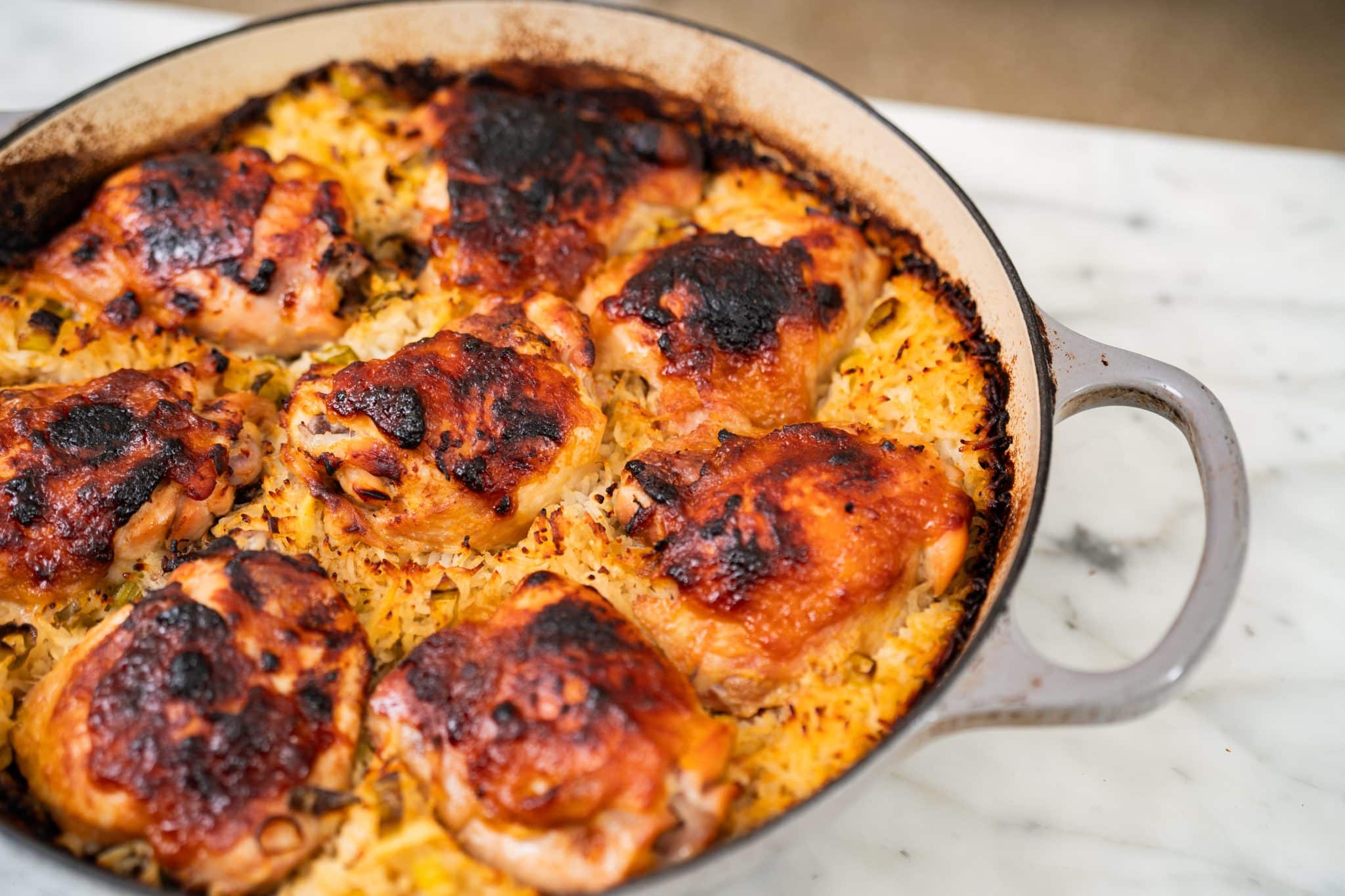 After 40 minutes, remove the lid, baste the thighs with the remaining miso honey mixture and roast for another 15-20 minutes until golden and the rice has crisped around the edges.