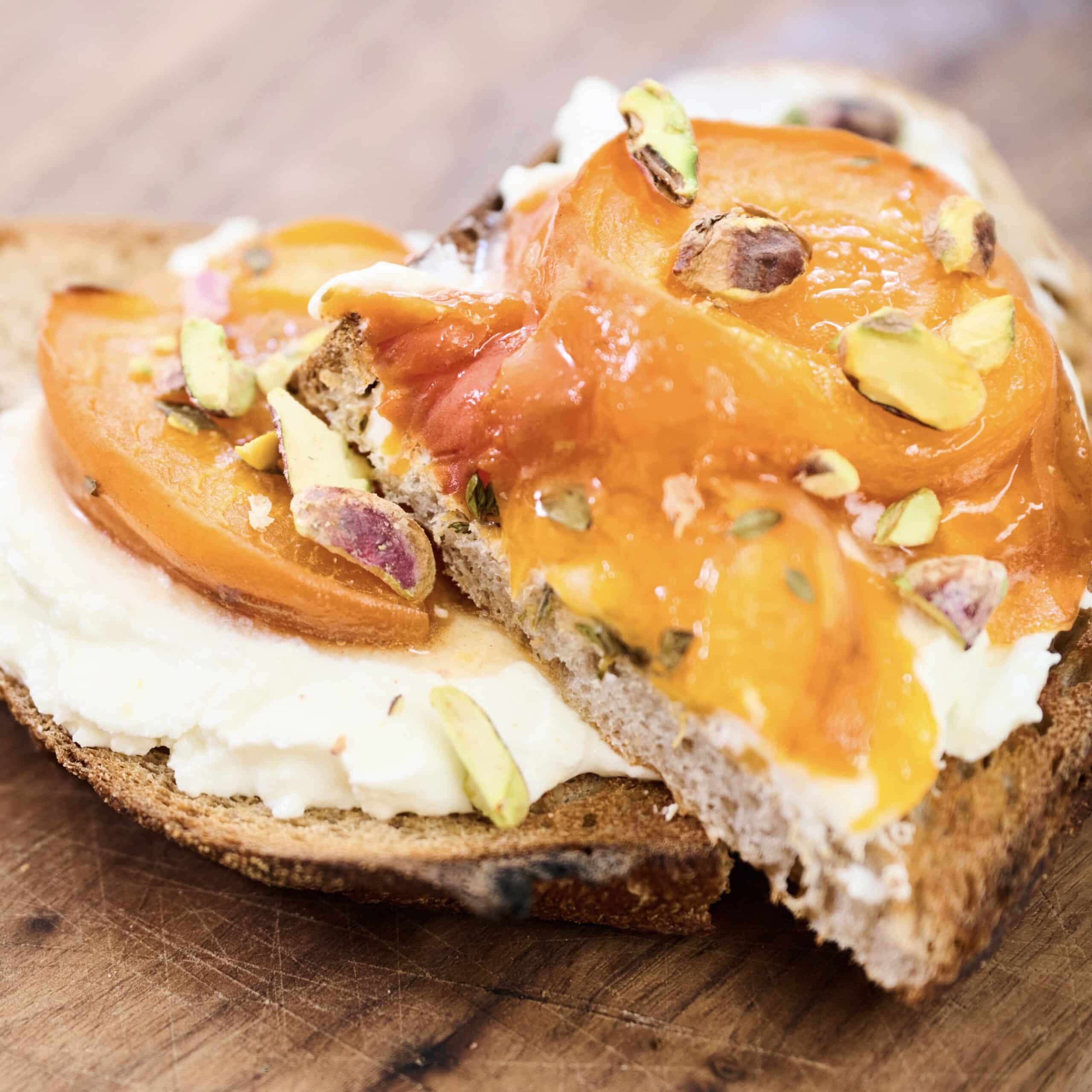 This is less of a recipe and more of an idea, so I’m just sharing this short video so you can see how. Basically all you need to do is cut a thick slice of your favourite sourdough, toast it well, schmear it generously with some whipped feta, labeneh or ricotta (really the tart dairy of choice is yours), lay over some of those delicious honey thyme roasted apricots (or peaches or plums which can be roasted in exactly the same way), top with some roughly chopped toasted pistachios for crunch. And devour (usually standing up with apricot jus trickling down your chin).