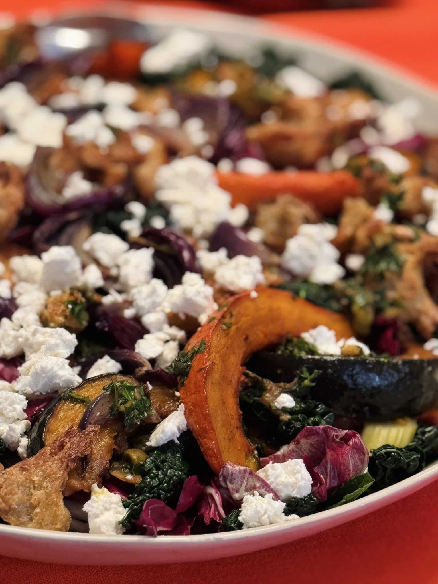 Not only is this salad an autumnal rainbow, every ingredient here can be made ahead of time, placing this dish safely in the lauded category of how to use your leftovers. It’s arrestingly beautiful (in salad terms) not because you need to perform kitchen gymnastics, but because the basic ingredients are so effing gorgeous in their own right. This is just as as perfect for a solo lunch as it is for a large gathering with the added bonus that this is a rare salad that actually benefits from hanging out in the dressing for a little while before serving. The ingredients are robust enough that they don’t wilt and the croutons become even more delicious with the lemony verde situ.